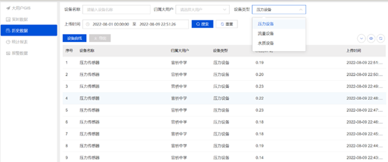 SCADA系统为客户提供了多元化的历史数据查询方式,客户可按日、周、月等时间形式或按照压力、流量、水质等设备类型进行水源、水厂、监测点、大客户等的综合查询,帮助客户多维度分析数据,实现数据更深层的价值,同时提供了导出报表的功能,取代了原来纸质记录及每日上报的工作,实现了客户的高效办公。