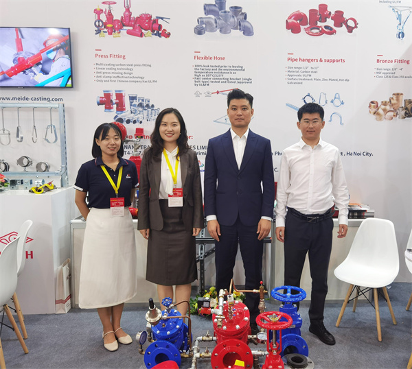 玫德集团在A馆A805展位为客户展出了众多消防产品,包括碳钢齿环卡压管件、碳钢卡压管件、消防金属软管、玛钢管件、沟槽管件、阀门、水表、灌浆套筒、不锈钢管材管件、支吊架,抗震支架等产品,为全球用户提供消防领域一站式产品。