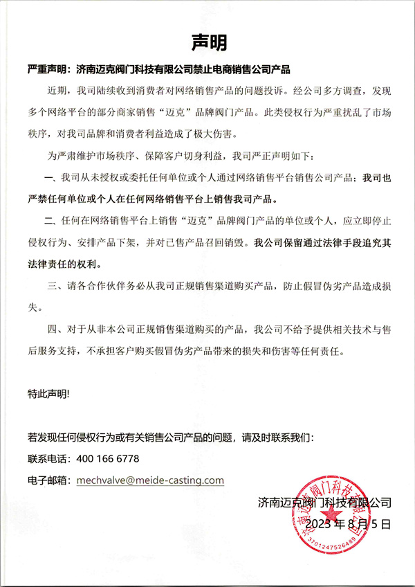近期,我司陆续收到消费者对网络销售产品的问题投诉。经过公司多方调查,发现多个网络平台的部分商家销售“迈克”品牌阀门产品。此类侵权行为严重扰乱了市场秩序,对我司品牌和消费者利益造成了极大伤害。对此,我司严正声明: