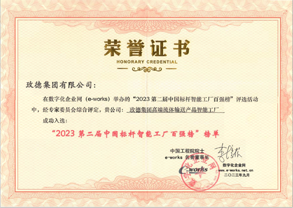 9月7日,智能铸造研究咨询机构e-works发布了由李培根院士及长期专注智能制造领域的院士级专家组成的评审委员会综合评定的《第二届中国标杆智能工厂百强榜》,玫德集团有限公司“高端流体输送产品智能工厂”成功入选第二届中国标杆智能工厂百强榜,是山东省入选的9家工厂之一。玫德集团一直探索细分领域智能工厂的关键技术和实践经验,争做中国本土智能工厂的标杆。“高端流体输送产品智能工厂”的成功入选是对集团推进玫德智能化、数字化工厂建设成效的肯定,标志着玫德集团的智能制造水平已处于国内和行业领先水平。