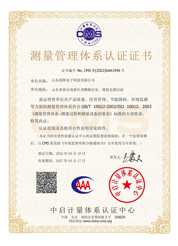 本次审核由权威机构组织进行,涵盖了山东晨晖电子科技有限公司在测量管理体系方面的各项标准及实施情况。经过严格的审查和评估,山东晨晖电子科技有限公司的测量管理体系顺利通过年度监督审核。