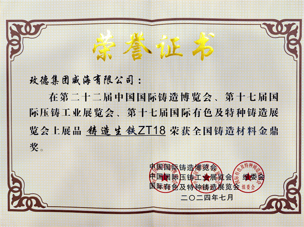 4.玫德集团威海有限公司展品“铸造生铁ZT18”荣获全国铸造材料金鼎奖。