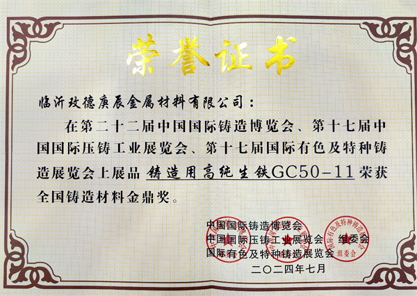3.临沂玫德庚辰金属材料有限公司展品“铸造用高纯生铁GC50-11”荣获全国铸造材料金鼎奖。