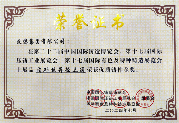 1.玫德集团有限公司展品“内外丝异径三通”荣获优质铸件金奖。
