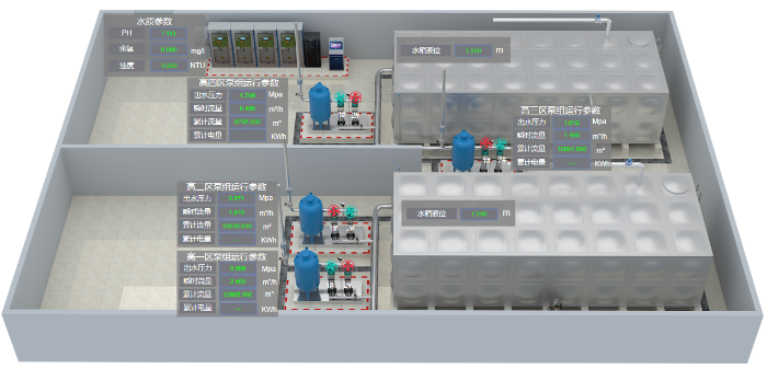 系统对泵房运行态势、门禁状态和视频监控三维可视化管理,实现泵房全方位管控。通过系统可以全面监测泵房各项指标数据,确保供水系统稳定运行。对采集的海量数据进行深度处理和分析,实现泵房潜在故障及时预警。系统可以实时对供水数据进行监控,实现错峰调蓄。可将泵房的历史数据和运行情况进行展示,为管理者决策提供精准的数据支持,同时当系统监测到泵房异常时,会自动智能识别并发出警报,使运维人员快速响应,减少事故损失,实现风险快速感知、一站调度,及时解决问题。