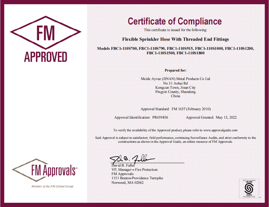 Meide FBC5 series flexible hose has obtained FM certificate!