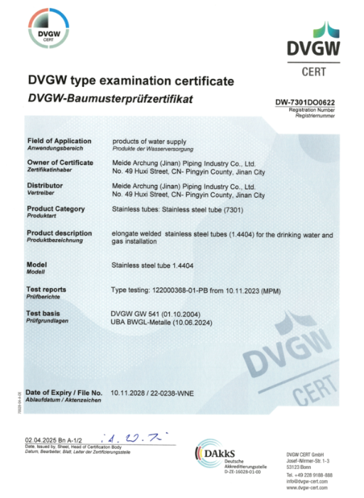 Meide Group's stainless steel pipes have passed DVGW certification.