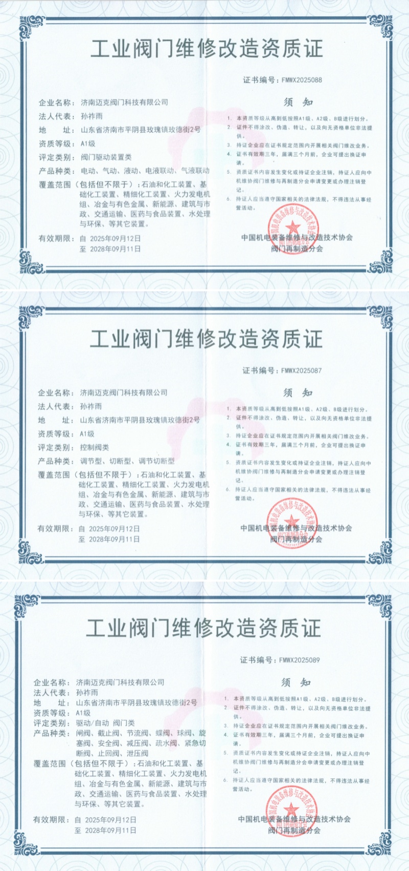 为规范工业阀门维修、改造、再制造企业的经营活动,促进产业规范发展,加强行业自律管理和技术进步,提高企业的服务质量,确保工业阀门运行安全,维护阀门维修、改造与再制造企业各方的正当权益,结合当前阀门维修与再制造企业实际情况,中国机电装备维修与改造技术协会阀门再制造分会(简称:中机维协阀门再制造分会)依据《通用机电装备维修改造企业能力评定规范》团体标准、中机维协《机电装备维修改造企业能力评定管理办法(2024版)》及《工业阀门维修改造企业资质等级评审细则》,及其他相关资质证书管理文件的规定开展“工业阀门维修改造企业资质等级评价”,结合国家及行业内服务型企业能力规范及标准,对企业从技术能力、管理水平、服务理念等各方面进行综合评判并做出等级评定。该证书是企业软、硬件实力的有效体现,有助于提升市场竞争力,树立品牌信誉,促进行业健康有序发展。